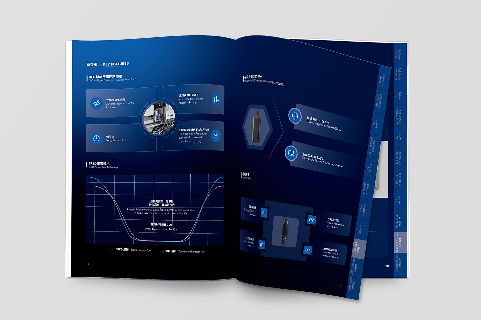 2. 深色系工業美學視覺體系構建: 開創性地采用深色背景(如深灰、墨藍)作為畫冊主基調。這一選擇不僅凸顯了機械設備本身的金屬質感與精密結構,更營造出專業、沉穩、高端的視覺氛圍,在眾多競品畫冊中脫穎而出,極具記憶點。