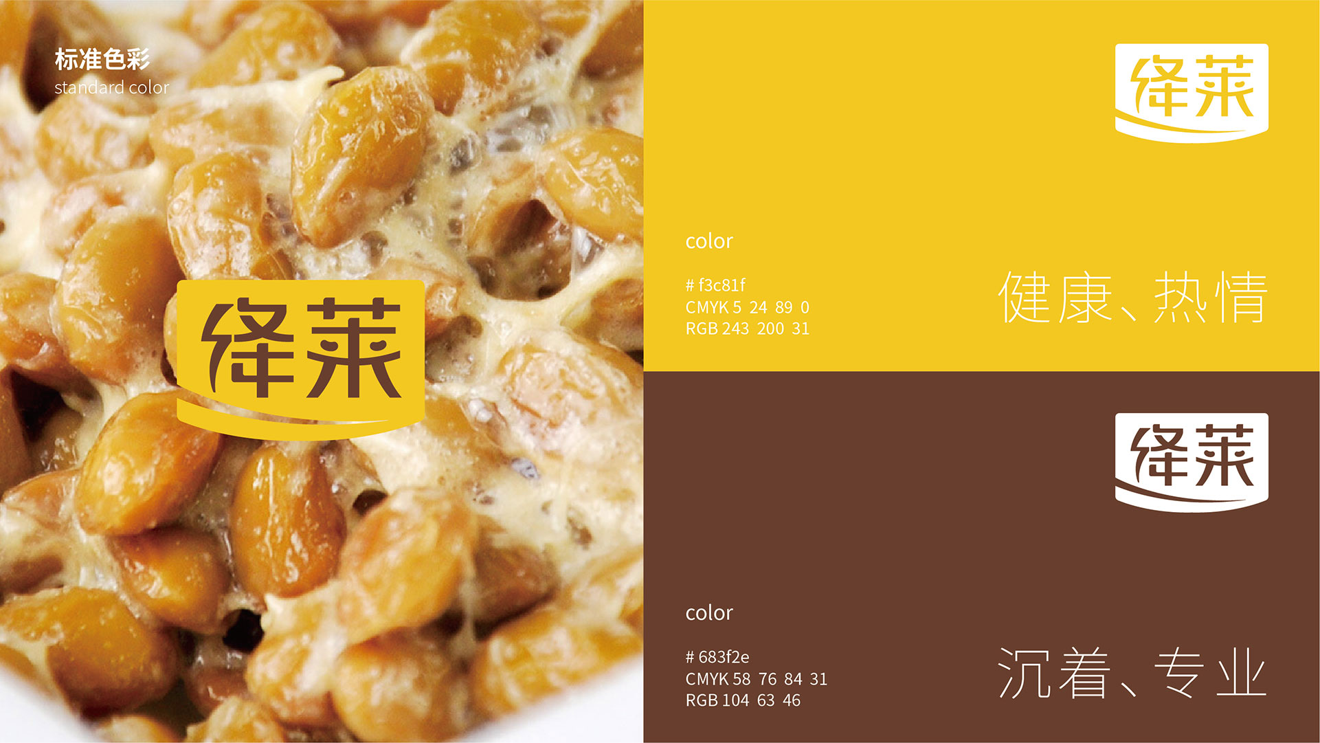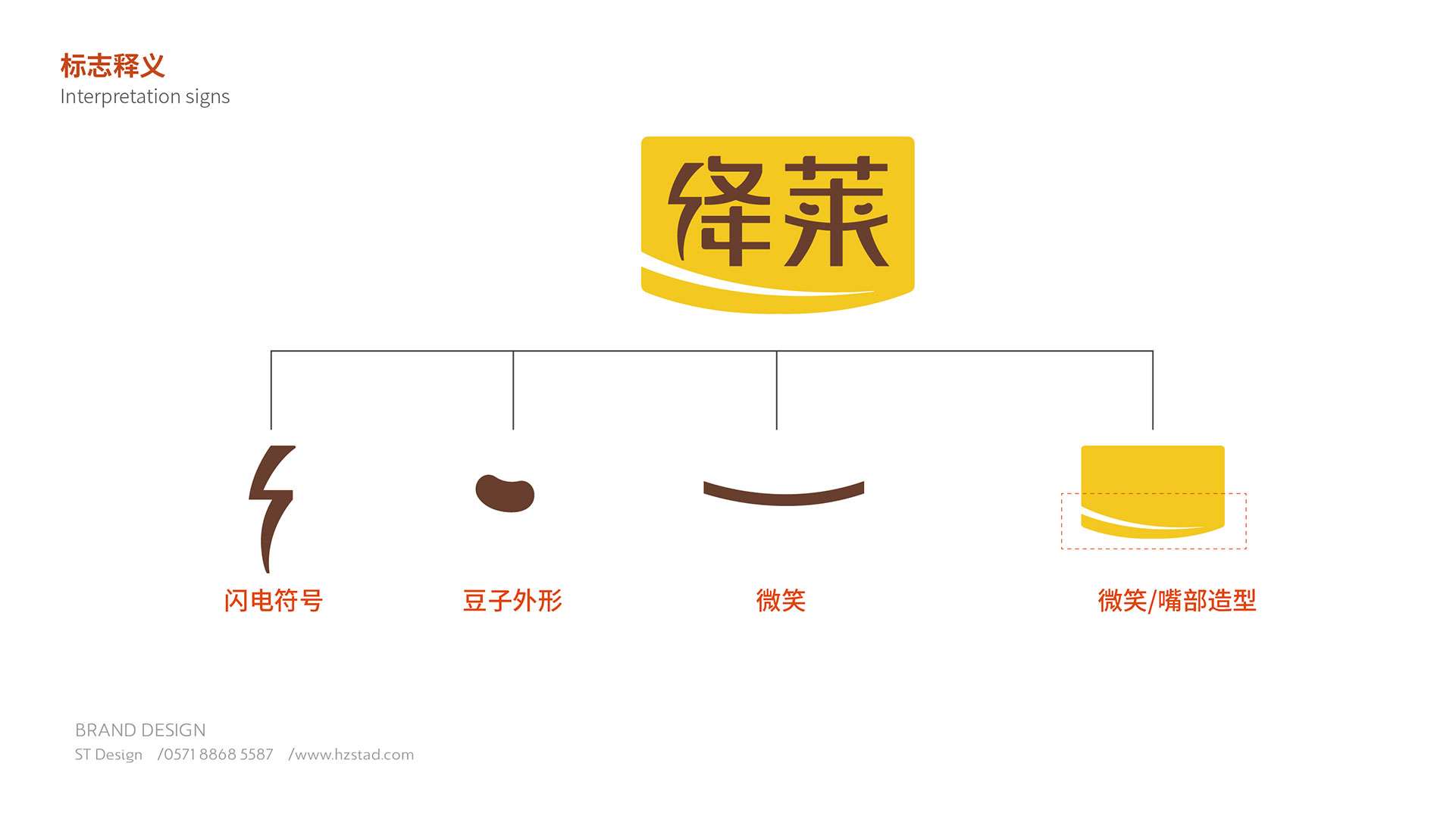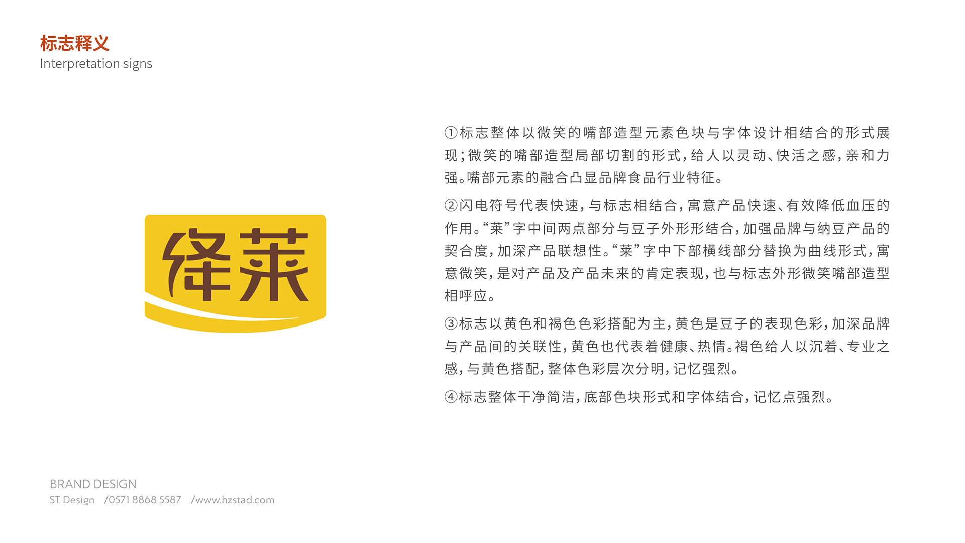 標志整體以微笑的嘴部造型元素色塊與字體設計相結合的形式展現;微笑的嘴部造型局部切割的形式,給人以靈動,快活之感,親和力強。閃電符號代表快速,與標志相結合,寓意產品快速,有效降低血壓的作用。“萊”字中間兩點部分與豆子外形相結合,加強品牌與納豆產品的契合度,加深產品的聯想性。